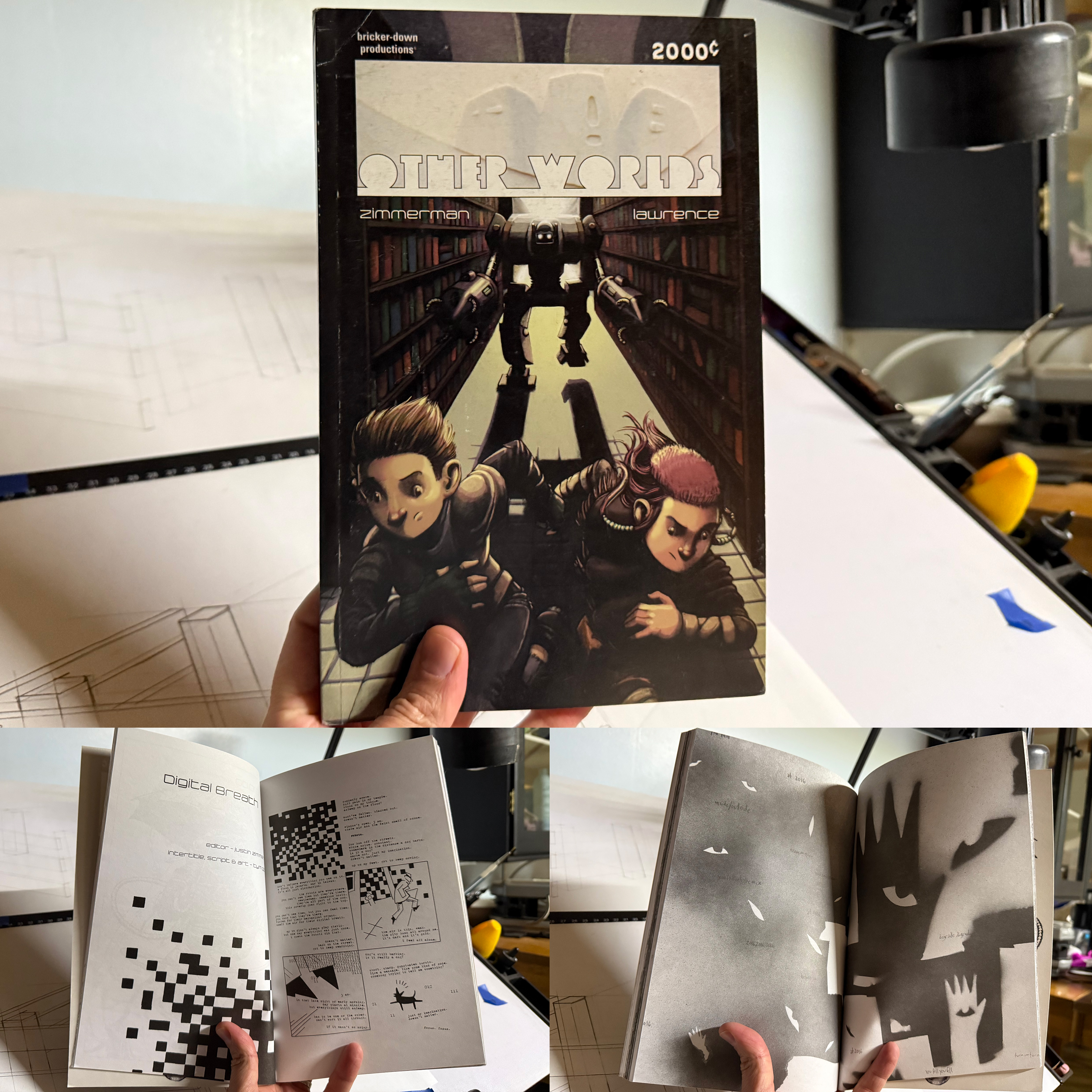 I have 2 pieces in here, “The Mix” - 50 watercolor-and-spray-paint illustrated pages adapted from a story by Justin - and “Digital Breath” - a three page paranoid fantasy and the only story in the book not written by Justin (originally ran as a backup in Justin’s single issue comic, “The Robot Library.”)